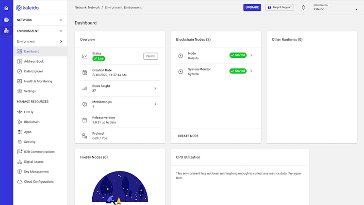 Kaleido is a blockchain platform designed to help businesses in banking, healthcare, entertainment, supply chain, financial services, and other sectors create, manage and track blockchain nodes and networks using various deployment options, built-in automated tools, and more. Administrators can handle keys, generate accounts for digital currencies and sign off transactions from within a unified interface.
