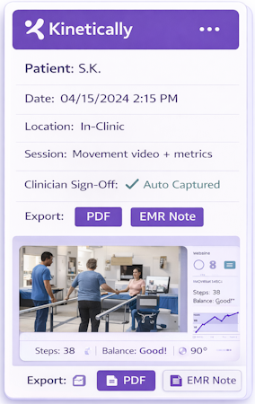 Kinetically is an AI powered movement analysis software platform that transforms standard smartphones into clinical grade motion assessment instruments for healthcare providers. The platform enables clinicians to quantify gait, balance and mobility using objective measurements that replace subjective visual assessments with data driven insights. The software serves healthcare professionals specializing in neurology, physical therapy, geriatrics and orthopedics who manage patients with neurological conditions, fall risk and mobility impairments. The solution combines advanced computer vision technology and clinical expertise in order to facilitate faster assessments, transparent progress tracking and more informed clinical decision making.
