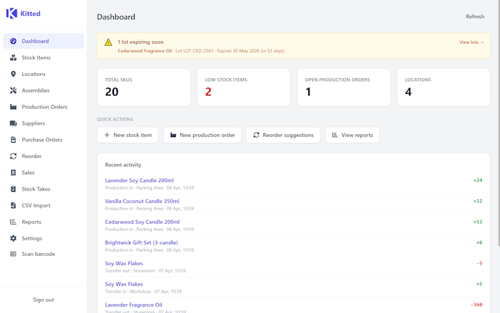 Kitted is a desktop production management software designed for small scale manufacturers and artisan producers requiring integrated control over inventory, production orders and purchasing. The application installs locally on Windows, Mac and Linux systems and retains all business data on the host machine. The solution targets small producers such as craft manufacturers, home bakers, electronics kit assemblers and workshop operators that have outgrown spreadsheet based inventory tracking. The licensing model provides perpetual use rights after a single acquisition while maintaining full production management functionality.