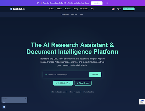 Kognos is an artificial intelligence research assistant and document intelligence platform designed to transform web pages, PDF files, and various document formats into structured actionable insights. The platform employs advanced artificial intelligence processing to extract, summarize, and analyze information from diverse research materials with automated efficiency. It serves a wide professional audience that includes academic researchers, college students, journalists, business professionals conducting market intelligence, and organizations requiring systematic document processing capabilities. Kognos maintains compatibility with the legacy URLTexter tool while delivering enhanced analytical and content processing capabilities.