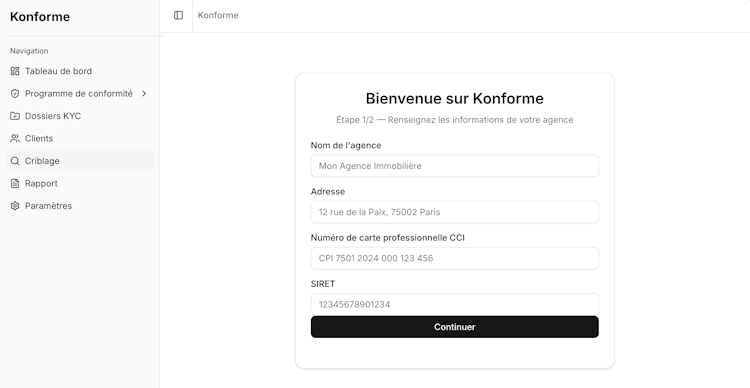 Konforme is an anti-money laundering and counter-terrorism financing compliance software platform designed for real estate professionals operating in France. The platform addresses regulatory obligations established by the French Monetary and Financial Code under articles L point five six one and subsequent articles. It supports independent agents, small agencies, networked agency groups and multi-collaborator structures subject to intensifying controls from regulatory authorities such as DGCCRF and Tracfin. The solution aligns due diligence procedures with statutory requirements for client verification and risk management.