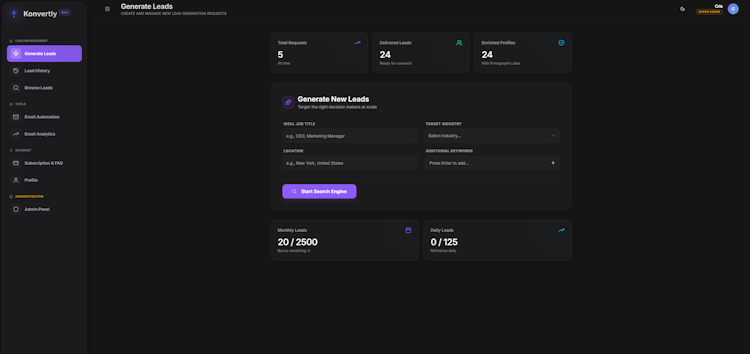 Konvertly is an artificial intelligence powered lead generation and outbound sales automation platform that streamlines the prospecting process for business teams. The platform functions as a comprehensive autonomous outbound engine by automatically sourcing verified contacts, crafting tailored email campaigns, and managing follow-up sequences without manual intervention. The solution enables meeting schedules to populate integrated calendars through a continuous outreach workflow. The system supports founders, solopreneurs, small agencies, independent consultants, and compact sales teams seeking consistent lead generation without expanding headcount.