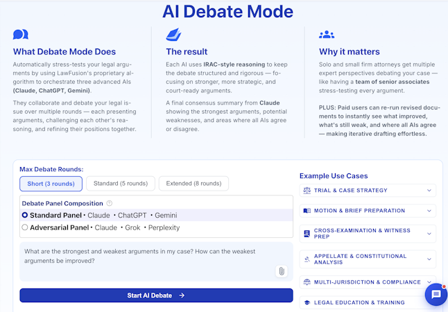 The Multi-AI Collaboration Engine coordinates ChatGPT, Claude, Gemini, Grok and Perplexity to analyze legal questions simultaneously. Each model processes the issue independently and challenges the reasoning provided by other models to create a cross-examination environment. The AI Debate Mode automates adversarial analysis by programming different AI models to argue opposing sides of legal issues and simulates courtroom debate scenarios. This feature systematically stress-tests legal theories by generating counterarguments and identifying overlooked precedents that opposing counsel might exploit. The Intelligence Multiplier functionality synthesizes outputs from all five AI perspectives into a unified analysis that combines diverse reasoning approaches and produces comprehensive legal research. Users receive consolidated reports that integrate AI-generated insights into coherent legal arguments with supporting analysis.