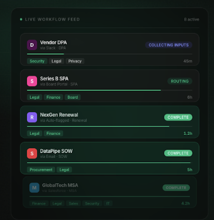 The platform employs AI agents that engage stakeholders via natural language interactions in Slack and email and collect structured inputs through button-based prompts within familiar tools. This approach removes meetings and context-switching by enabling departments to answer agreement-related questions directly in their communication channels. An AI review agent pre-screens each agreement against configurable negotiation playbooks, performs completeness scoring, risk flagging, conflict detection, and deviation identification from established legal standards before routing for general counsel review. A counterparty negotiation module conducts up to three automated negotiation rounds with progressively tightening deadlines before escalating to structured calls with full context.
