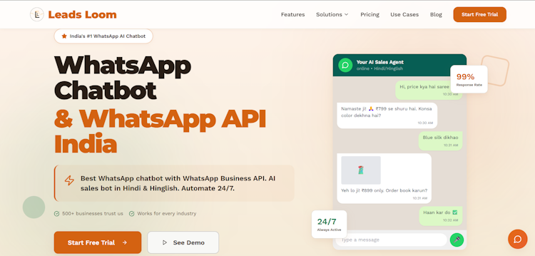 Leads Loom is a cloud based software as a service platform that enables AI powered conversational automation and sales management through the WhatsApp channel. It integrates directly with the WhatsApp Business API to facilitate automated customer engagement, lead organization, and order processing. The solution addresses the needs of businesses in retail, wholesale, textile, e-commerce, healthcare, restaurant, education, real estate, and service sectors. Multilingual support for Hindi, Hinglish, English, Telugu, Marathi and additional regional languages allows automatic detection of customer language preferences.