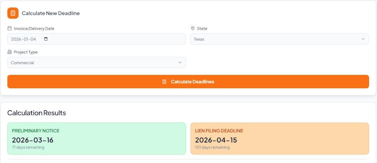 LienDeadline is a mechanics lien deadline calculation software designed for construction industry professionals including building material suppliers, credit managers and chief financial officers. The platform automates deadline tracking for preliminary notices and lien filings across all fifty states plus the District of Columbia. Users input an invoice or delivery date and select the project location to generate statutory notice and filing deadlines according to current state statutes. Quarterly legislative updates maintain accuracy across all jurisdictions.