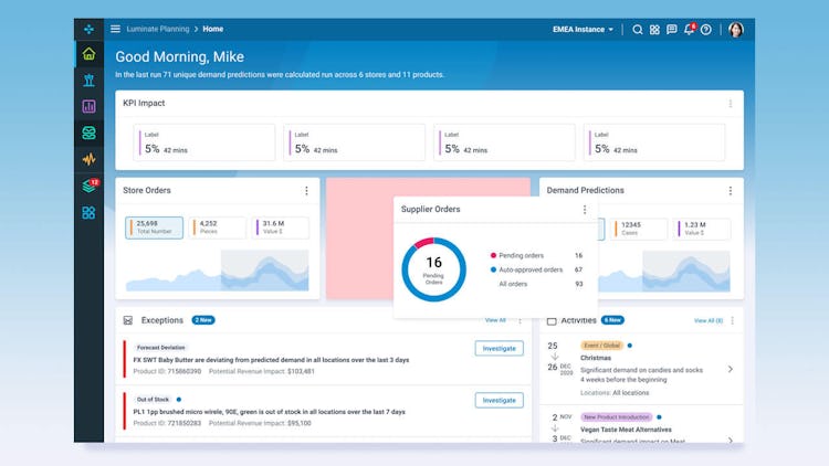 Luminate Platform by Blue Yonder (formerly known as JDA Software) is a supply chain solution that uses AI and ML to provide supply chain visibility that helps optimize business decisions. It can help predict, prevent, and resolve business disruptions. Luminate Platform is suitable for retail grocers, automotive and industrial, high-tech and semiconductor, plus other industries.
