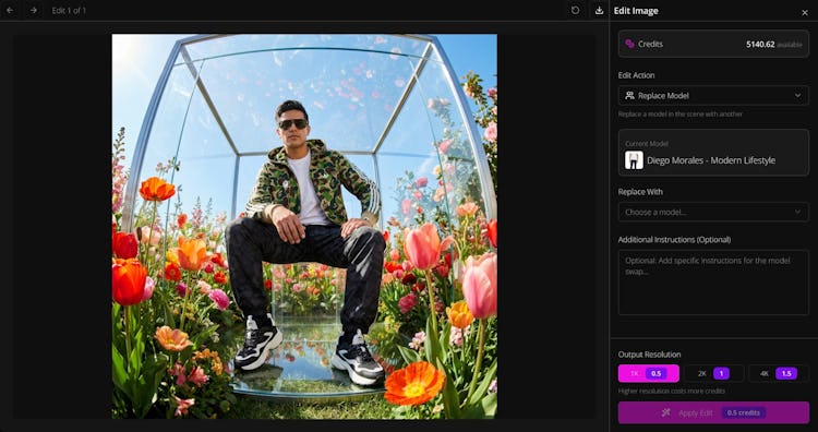 The platform provides a comprehensive suite of tools for visual content creation. Users can assemble photorealistic product scenes by placing single or multiple items into curated or custom environments without the need for prompt engineering expertise. The platform includes fashion and model visualization for realistic campaign imagery, enabling businesses to upload models and integrate garments. The system supports multiple models within a single scene to accommodate diverse presentation needs. The workflow consists of selecting style and location environments, inserting products and models, configuring photoshoot parameters such as resolution and lighting, and then generating and downloading finalized visuals.