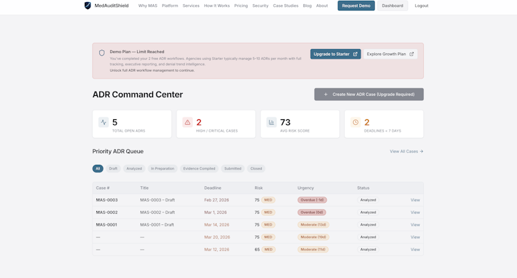 MedAuditShield is a workflow management platform for Medicare Additional Documentation Requests within the United States hospice sector. The platform centralizes command and control of audit response processes by providing structured tracking of submission deadlines, organization of supporting documentation, and mitigation of denial risk stemming from incomplete packets or missed timelines. It replaces decentralized spreadsheet tracking methods, email chains, and shared file repositories with a unified environment suited to the needs of hospice billing managers, compliance officers, and revenue cycle professionals handling Medicare Administrative Contractor audit requests within prescribed timeframes.