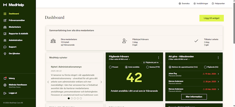 MedHelp Care is an integrated health and absence management platform that enables organizations to monitor and manage employee sick leave through data-driven insights and artificial intelligence. The solution addresses the needs of human resources departments, management teams and executive leadership within Swedish workplaces. Its design supports early identification of health risks and facilitates proactive interventions aimed at minimising the development of extended absence periods.