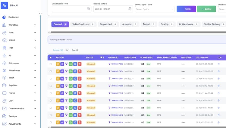 Suite-level extensions expand functionality for organizations with advanced requirements. The Warehouse Suite delivers mobile warehouse management capabilities such as receiving, inventory slotting, pick-and-pack operations, loadout coordination, and returns processing with quality assurance and control workflows supported by photographic documentation and condition grading. The Enterprise and Milo AI Suite adds omnichannel communication automation across messaging and voice channels, multi-carrier orchestration from cash-on-delivery collection through payout management, and consolidated dashboards displaying operational cost, cash-on-delivery status, and carbon equivalent emissions per order, stop, and distance. Both extensions support integration with major enterprise resource planning systems including Odoo, Oracle, SAP, Microsoft Dynamics, and JD Edwards.