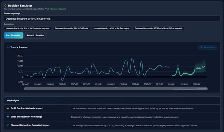 An adaptive visualization engine recommends optimal chart types such as line graphs, bar charts, pie charts, and heatmaps based on the specific data structure and analytical question, removing guesswork from the visualization selection process. A data preparation layer operates with a human in the loop to interpret raw data inputs, ensuring proper structuring and contextualization before analysis begins. Insight generation extends beyond standard charting by summarizing the reasoning behind numerical patterns in executive-ready language, making complex analytical findings accessible to nontechnical stakeholders.
