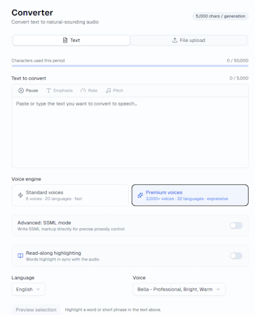 The document processing engine automatically extracts text from uploaded PDF and DOCX files, eliminating manual copy-and-paste workflows for longer documents. Users select from twenty supported languages and six expressive voice options powered by advanced AI text-to-speech technology, with each voice offering warm and clear audio characteristics suitable for educational content delivery. The conversion process follows a three-step workflow: content is added via text input or document upload, language and voice options are selected, and downloadable MP3 audio files are generated with preview functionality before export. All conversions are stored in a searchable history that allows access to and reuse of previously generated audio files.