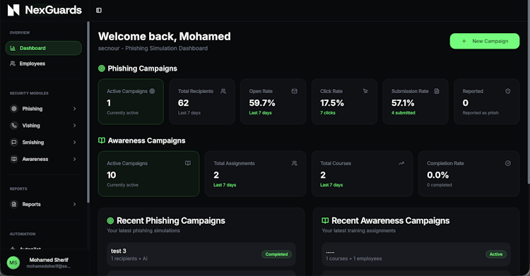 NexGuards is an AI powered social engineering simulation and cybersecurity awareness platform designed to help organizations identify, measure, and reduce human related security risks through realistic attack simulations and adaptive training programs. The platform enables security teams to conduct personalized phishing, vishing, and smishing campaigns that mirror modern threat actor tactics while delivering contextual security awareness training and maintaining comprehensive risk analytics. It serves organizations in finance, healthcare, technology, government, education, and energy sectors that require human risk management capabilities with compliance ready security awareness programs.