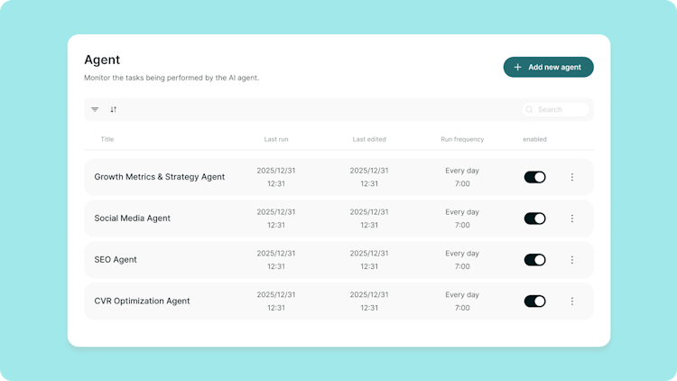 Users interact with a live work feed where generated content and proposed actions are presented for review and approval within a unified workspace. Customizable pages and block editors support the design of dashboards, content calendars, post editors, and task inboxes that align with specific operational needs. An integrated knowledge base and memory system captures historical data and feedback to ensure continuous learning and improvement across all agent activities.