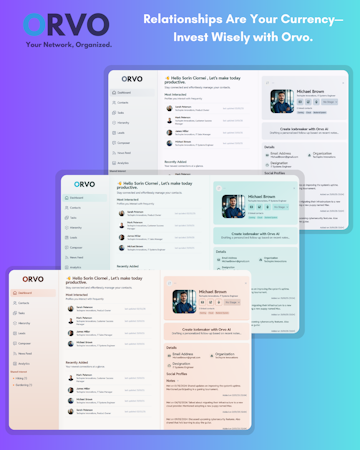 The system features a comprehensive suite of tools including an activity timeline that automatically logs key moments such as new connections, profile updates, and birthdays for easy reference. The centralized task management functionality allows users to organize follow-ups and meetings in one location, keeping everything visible and actionable to reduce cognitive load. Orvo also provides a visual contact hierarchy view that maps how contacts are connected across teams, departments, and roles, enabling users to identify decision-makers, reporting structures, and key influencers at a glance. The personalized newsfeed surfaces relevant updates including job changes, industry news, shared articles, and milestones from contacts, creating a personal radar for network activity.