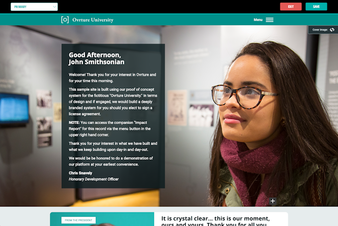 Ovrture is a cloud-based platform built to communicate with an organization’s existing and prospective major donors. The platform offers internal staff the ability to build, manage, and share an ecosystem of content across a client’s development team to build highly personalized cultivation or stewardship impact report microsites.