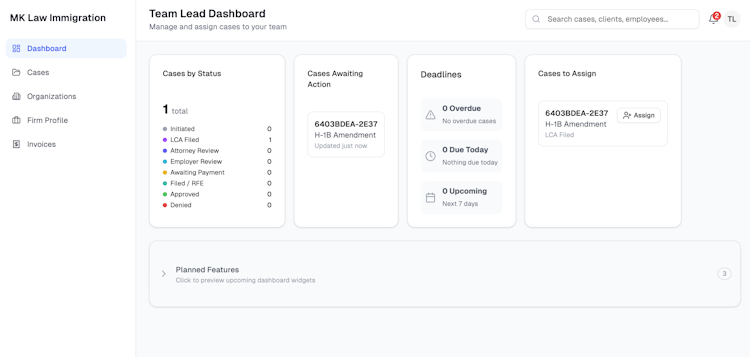 The platform features an intelligent document intake system that employs optical character recognition technology to extract and validate information from immigration documents such as passports, arrival and departure records, approval notices, degree certificates, resumes, and offer letters. A specialty occupation classification engine maps job duties to occupational data from the Occupational Information Network using algorithms trained on thousands of approved petitions. A pre-filing evidence-request scanner analyzes petitions against common denial triggers and flags potential issues for remediation. A compliance dashboard provides real-time health scoring across all active cases by monitoring federal employer identification number verification, beneficiary validation, wage-level determinations, industry classification accuracy, and Department of Labor submission readiness. The platform also automates labor condition application tracking, Form G-28 generation and signature collection, Form I-129 preparation, and visual case timelines that display petition status from intake through final approval.