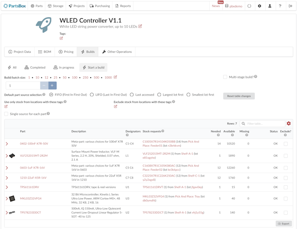Check buildability, remove parts from inventory, manage multi-stage builds. Keep track of multiple builds easily. Track completed builds as sub-assembly parts in your inventory. Use lot control to maintain full traceability from parts/orders to completed devices.