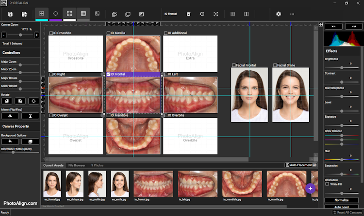 PhotoAlign is a dental photo editing tool, enabling professionals to process an entire 9-photo orthodontic set. PhotoAlign lets users edit and align photos, producing consistent, professional-quality sets. Its intuitive tools allow clinics to resize, crop, and rotate multiple photos with precision, adjust colors, and apply effects. Users can superimpose images using a reference photo for the best alignment match.