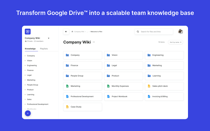 Pilot.io redefines the landscape of team knowledge management by seamlessly transforming Google Workspace into an AI-powered hub of productivity.
