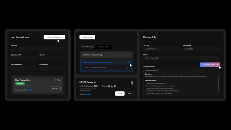 "Effortless Job Requisitions" :- Craft precise job requisitions that attract top talent. Quickly outline job roles, responsibilities, and qualifications. Seamlessly convert requisitions into engaging job descriptions. Post jobs for free across the career site.