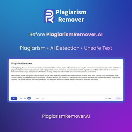 PlagiarismRemover.AI is a web-based content rewriting application designed to eliminate plagiarism by analyzing and restructuring content at the sentence level while preserving original meaning and formatting. The platform addresses unintentional overlap in academic writing and content repurposing needs in professional settings by delivering context-aware rewrites that maintain natural readability rather than relying on basic synonym substitution. It processes a wide range of document types including essays, research papers, theses, dissertations, blog posts, marketing copy, professional reports, presentations and educational materials. The tool operates without requiring user registration for basic functionality.
