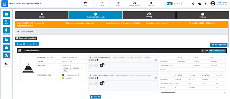 PMB empowers organizations to manage actions, projects, problem-solving initiatives, SWOT analyses, and key performance indicators while presenting real-time indicators directly to management for facilitated decision-making.