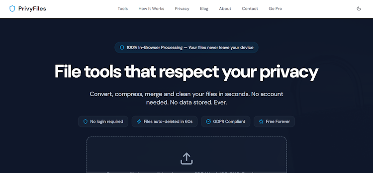 PrivyFiles is a browser-based file conversion and PDF management application that enables document conversion, compression, merging and cleaning operations entirely within the web browser. It operates on a privacy-first architecture that prevents transmission of documents to external servers. The application does not require user authentication or account creation and processes files anonymously without tracking or storing data.