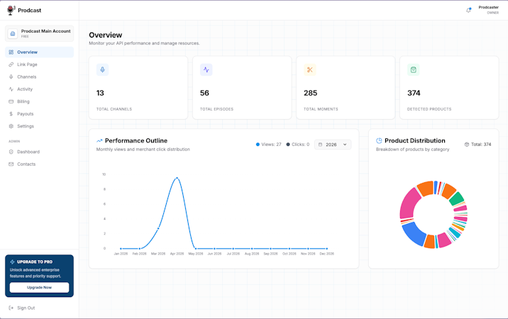 Prodcast Studio is an AI powered affiliate monetization platform designed for content creators who produce long form video and audio content. The platform automatically scans YouTube video URLs and podcast episode feeds to identify product mentions and generate affiliate links without manual intervention. Detected items and corresponding affiliate links are compiled in a dynamic storefront that serves as a custom link in bio solution. The storefront updates automatically as new content is published.