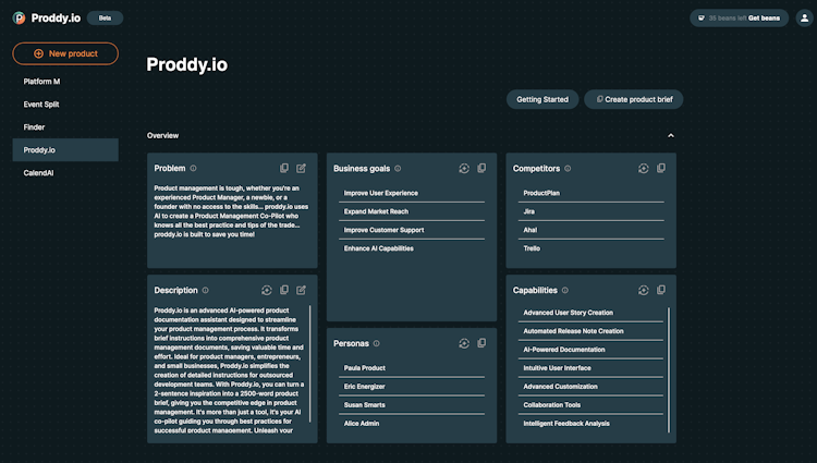 Proddy.io allows users to create long-form products and write custom user stories for personas. The application enables teams to create release notes and automatically convert basic instructions into formal product management documentation. Users can also view and analyze customer feedback to improve the documents.