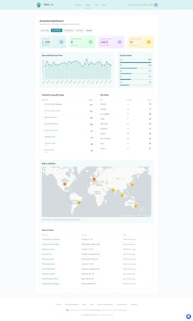 The platform’s core functionality centers on dynamic QR code generation and modification of destination URLs after distribution, eliminating the need to reprint physical materials. It supports multiple QR code formats including web links, email messages, telephone numbers, text messages, messaging app shortcuts, and wireless network access configurations. The branding customization feature enables seamless integration of company logos and brand colors to maintain visual consistency. The analytics dashboard offers real-time tracking with interactive daily, weekly, and monthly activity charts, geographical distribution maps with clustered markers and zoom controls, and location-level insights at the city level. Data filtering is available through preset time periods or custom date ranges and top-performing QR codes can be identified through aggregated performance metrics.