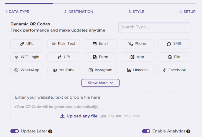The platform supports more than twenty five data types for code creation. Supported types include uniform resource locators, plain text entries, electronic mail addresses, telephone numbers, short message service entries, wireless network credentials, unified payment interface details, survey and feedback form links, mobile application destinations, file attachments in common formats, messaging application contacts, video resource identifiers and social media profile links. Specialized code options exist for digital contact cards, calendar event entries, online review prompts, payment endpoints, cryptocurrency wallet addresses and geographical location references.