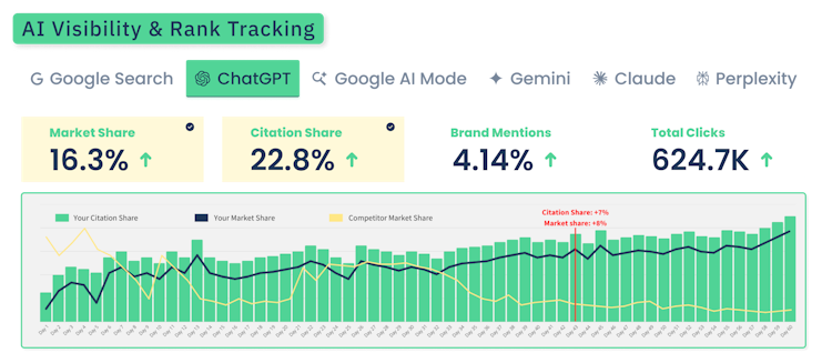 The result is a unified path from data → insight → content → authority. Your brand is not just found, but featured—discovered, indexed, and cited across Google AI Overviews and leading LLMs (AEO & GEO). Quattr shows where visibility is gained or lost, tracks market and citation share, benchmarks ranking factors (content quality, relevance, performance, accessibility, best practices, SEO compliance, mobile-friendliness), and lets teams resolve issues without switching tools.