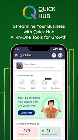 Quick Hub is a comprehensive suite of tools designed to help businesses enhance customer engagement, manage online reputation, streamline social media activities, and run marketing campaigns. The platform offers four main products, including Quick Reviews, Quick Chat, Quick Social, and Quick Campaigns.