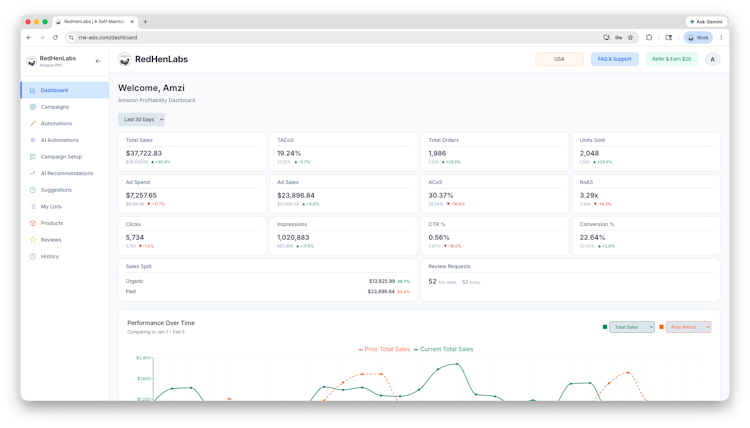 RedHenLabs is a platform for Amazon seller profitability that unifies real time profit tracking with automated pay per click advertising optimization tools. It is designed for sellers who operate their own brands and require granular insight into profit margins rather than revenue alone. The platform bridges the gap between advertising cost of sale reporting and actual profitability by accounting for cost of goods sold, fulfillment fees, advertising expenses and returns in product level profit calculations. It serves sellers in the United States, Canada, Mexico and Brazil marketplaces that seek analytical transparency and automated campaign management without pricing based on ad spend.