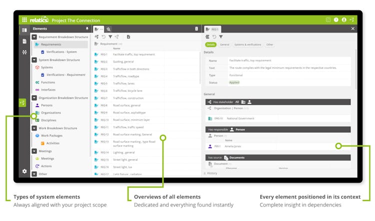 Relatics is the leading Model-Based Systems Engineering software application for construction projects. It is a comprehensive tool that gives professionals access to all project information and offers a complete overview of the growing number of dependencies between all disciplines in today’s projects. This ensures nothing is overlooked, giving you the confidence to make well-informed and timely decisions.