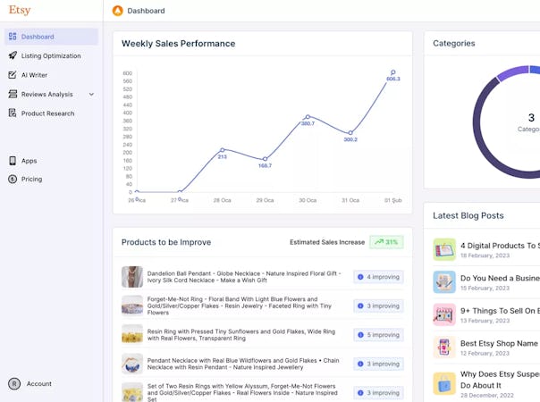 Roketfy is a comprehensive toolkit designed to supercharge your Etsy business. From optimizing your listings and generating SEO-friendly content to analyzing competitors and identifying valuable market trends, Roketfy equips you with the tools you need to increase visibility, enhance customer satisfaction, and maximize sales on Etsy