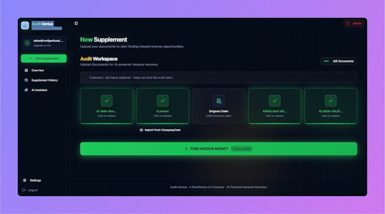 RoofGenius AI is an artificial intelligence platform designed for roofing contractors who manage insurance claims and retail roofing projects. The platform automates damage detection, audits insurer estimates, and generates carrier-ready supplement documentation to recover additional claim value overlooked in initial assessments. It supports contractors in both residential and commercial sectors by streamlining workflows for claim supplementation, proposal generation, and property measurement.