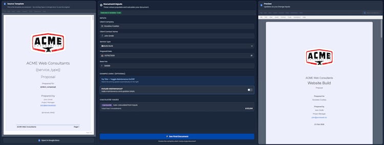 The platform integrates directly with Google Docs and requires no migration from existing workflows or adoption of proprietary editing tools. The system applies rules to the original template format and preserves full ownership and editing control of assembled documents. Multiple team members can assemble scope documents using a common rule set to ensure consistency in pricing logic, structural formatting and project assumptions across personnel. Email support is available for setup assistance and ongoing operational inquiries.