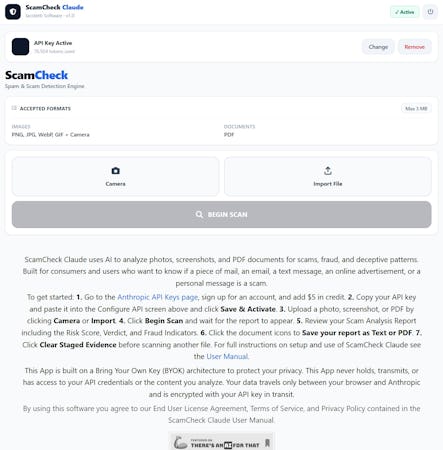 The application operates on a Bring Your Own Key (BYOK) model, integrating directly with the Anthropic API using credentials you provision and manage. To get started, visit console.anthropic.com, create a free account, add a minimum of $5 in credits, and generate an API key. Paste the key into ScamCheck Claude and click Save & Activate — no installation required. Each scan incurs a usage fee determined by the complexity and size of the submitted media, typically ranging between four and eight cents per photo or screenshot and up to twelve cents for a multi-page PDF. No subscription fees apply and costs correspond solely to processing volume.