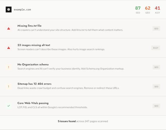 The platform performs automated scans each day that evaluate over fifty distinct checkpoints across the categories of SEO, GEO and accessibility compliance. The SEO monitoring functionality examines meta tags, schema markup, XML sitemaps, broken links and Core Web Vitals metrics that influence search rankings. The generative engine optimization assessment checks for llms.txt files that communicate site structure to AI crawlers, reviews structured data implementation for accurate AI citations and calculates a GEO score from zero to one hundred to quantify how effectively each page is understood and recommended by AI assistants. The accessibility component conducts compliance checks against accessibility standards to identify issues such as missing alternative text on images and other barriers that affect user experience and search performance.