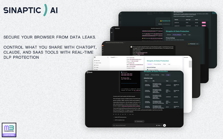 Sinaptic.AI is a browser based data protection extension designed to prevent the accidental leakage of personally identifiable information and protected health information to artificial intelligence platforms and services. The software functions as a real time security layer that intercepts and analyzes user input before sensitive data is transmitted to AI tools such as ChatGPT, Claude, and Gemini. It is built on Manifest V three architecture and targets enterprise organizations, compliance teams, chief information security officers, data protection officers, and individual professionals who require safeguards against inadvertent data exposure in AI interactions. The solution addresses shadow AI usage and data leakage risks while maintaining alignment with the M three Framework for secure AI adoption in organizational environments.