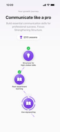 Content is organized into six skill categories. Communication Essentials focuses on clarity and persuasive dialogue. Leadership Core cultivates confidence and team influence. Negotiation and Influence supports structured deal-making and difficult conversation tactics. Critical Thinking emphasizes decision making under pressure. Innovation and Adaptability prepares users to respond effectively to change. Career Growth guides long-term trajectory planning. Learning is structured through bite-sized daily lessons requiring only five to ten minutes to progress, while a mission system encourages regular engagement and habit formation.