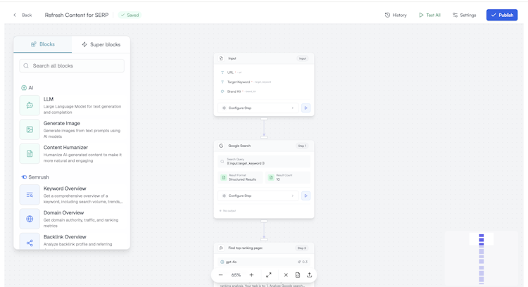 The platform offers capabilities organized around monitoring, automation, and governance. The AI Search Analytics component tracks visibility metrics on leading large language model based platforms and records citation dynamics along with position estimates. The visual Workflow Builder enables custom research write refresh pipelines that operate continuously without manual intervention. The Power Sheets interface supports bulk refresh operations across extensive content libraries within a familiar spreadsheet environment. Additional modules include preconfigured workflow components that capture industry best practices and brand governance tools that enforce style and tone consistency in all generated assets.