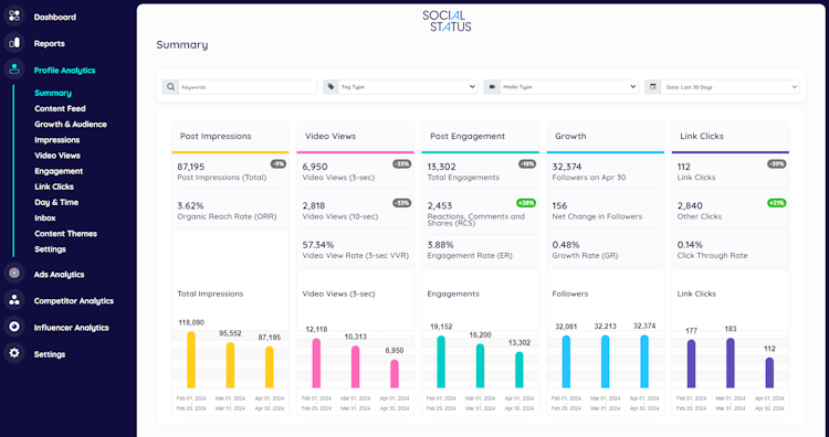 Profile Analytics for tracking all the pages and profiles you manage. Connect your Facebook, Instagram, TikTok, LinkedIn, YouTube and X profiles to see full funnel insights.