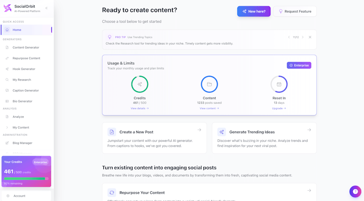 The content suite includes specialized generators for social media formats such as threaded updates short video scripts long form posts and visual carousels. Each tool applies strategic frameworks for hooks pacing and callouts to align messaging with platform conventions. A generator dedicated to profile biographies creates conversion oriented narrative text. A repurpose engine transforms existing assets into format adapted variations to maintain brand voice coherence across channels. A research module provides real time trend analysis and keyword suggestions to guide content planning.