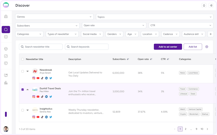 The platform features search and filtering capabilities that allow evaluation of publishers across key dimensions. Filtering by talking points and content themes enables identification of newsletters whose editorial focus aligns with target messaging and brand positioning. Filtering by existing advertisers provides transparency into brands sponsoring specific newsletters and supports competitive intelligence in media planning. Audience filtering functionality narrows results based on subscriber demographics and characteristics to align ideal customer profiles with appropriate newsletter audiences. Aggregation of publisher data streamlines a research process that traditionally depends on manual outreach and individual publisher vetting. The unified interface presents information on content focus, sponsorship availability, and audience composition to reduce the time required for publisher identification and preliminary evaluation.