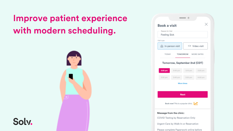 Solv Health is an on demand care platform that allows patients looking for faster access to care to find and book visits. Solv directs more patients to you and gives you and your staff tools to keep them coming back.