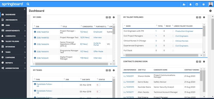 Springboard enables businesses to integrate the platform with various third-party applications, such as Aurion, First Advantage, Facebook, and more. The software also helps users view upcoming interviews, generate reports, track contract expirations, and generate administrative reports.